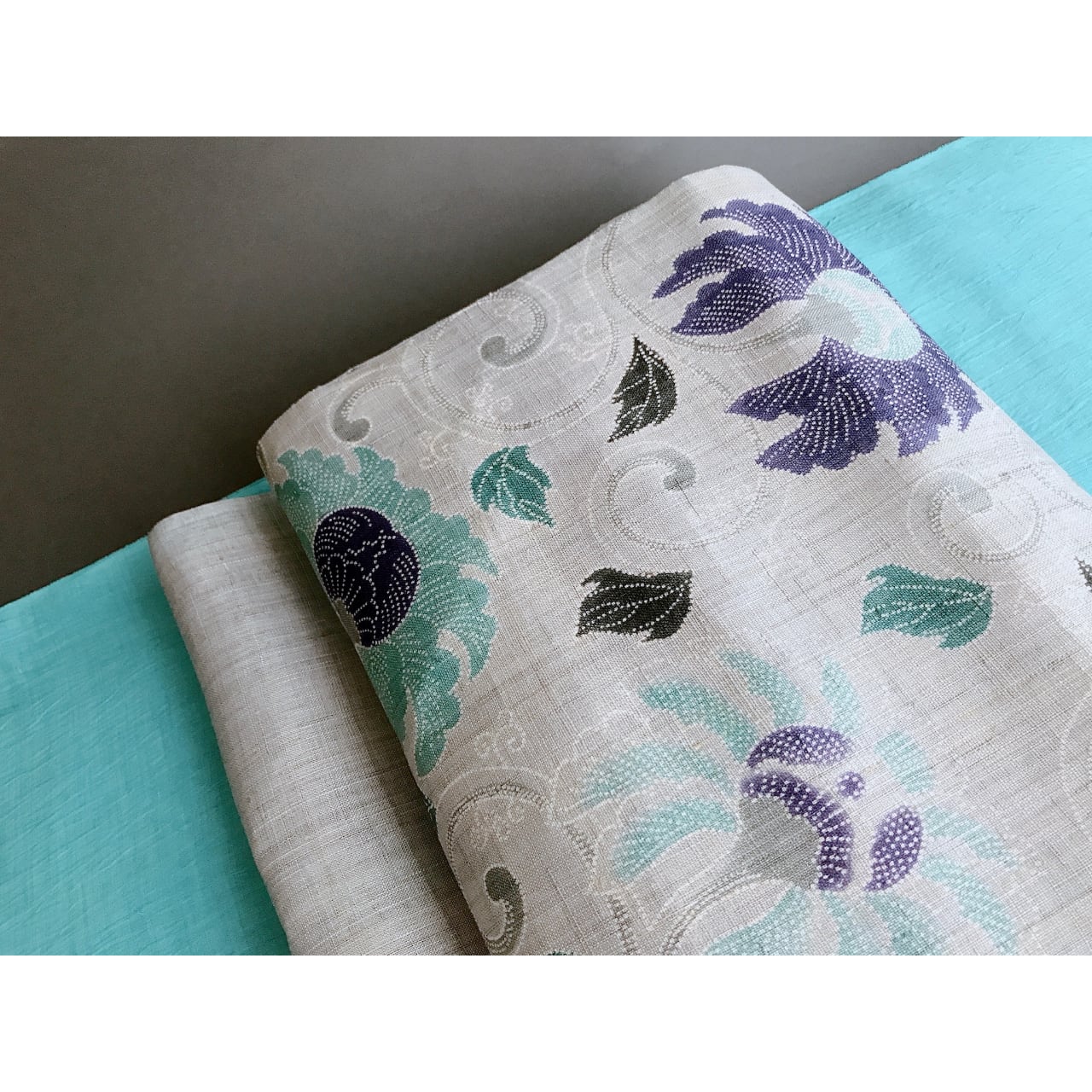 地色のアイスグレー×ブルー系の柄が涼やかな、夏の装いにピッタリの九寸帯です。